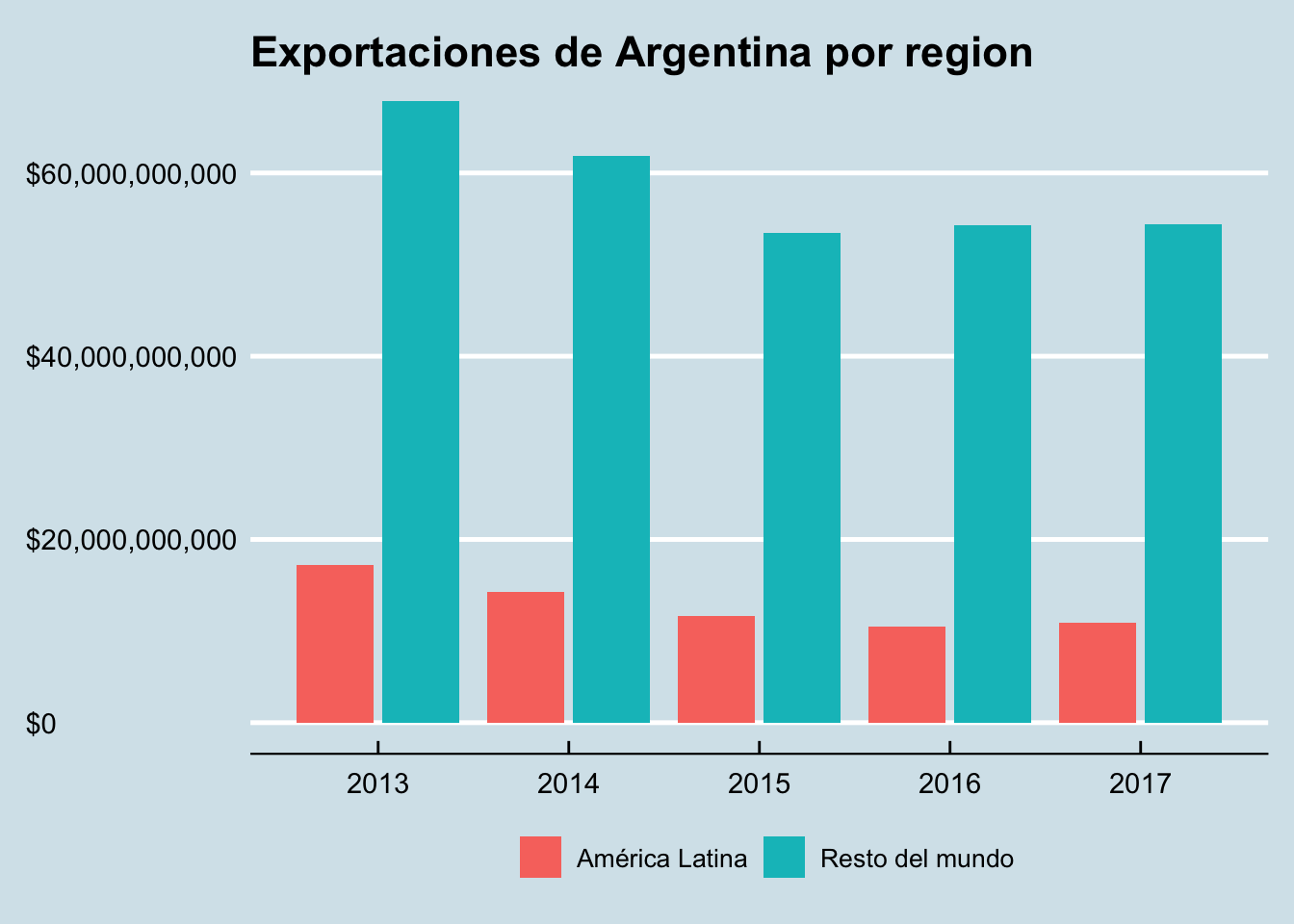 En esta segunda parte del post, me interesa analizar si los flujos de exportación de Argentina en los últimos años han ido más hacia América Latina o hacia el resto del mundo. Así se puede determinar donde se debería focusar iniciativas de mejorar las exportaciones.