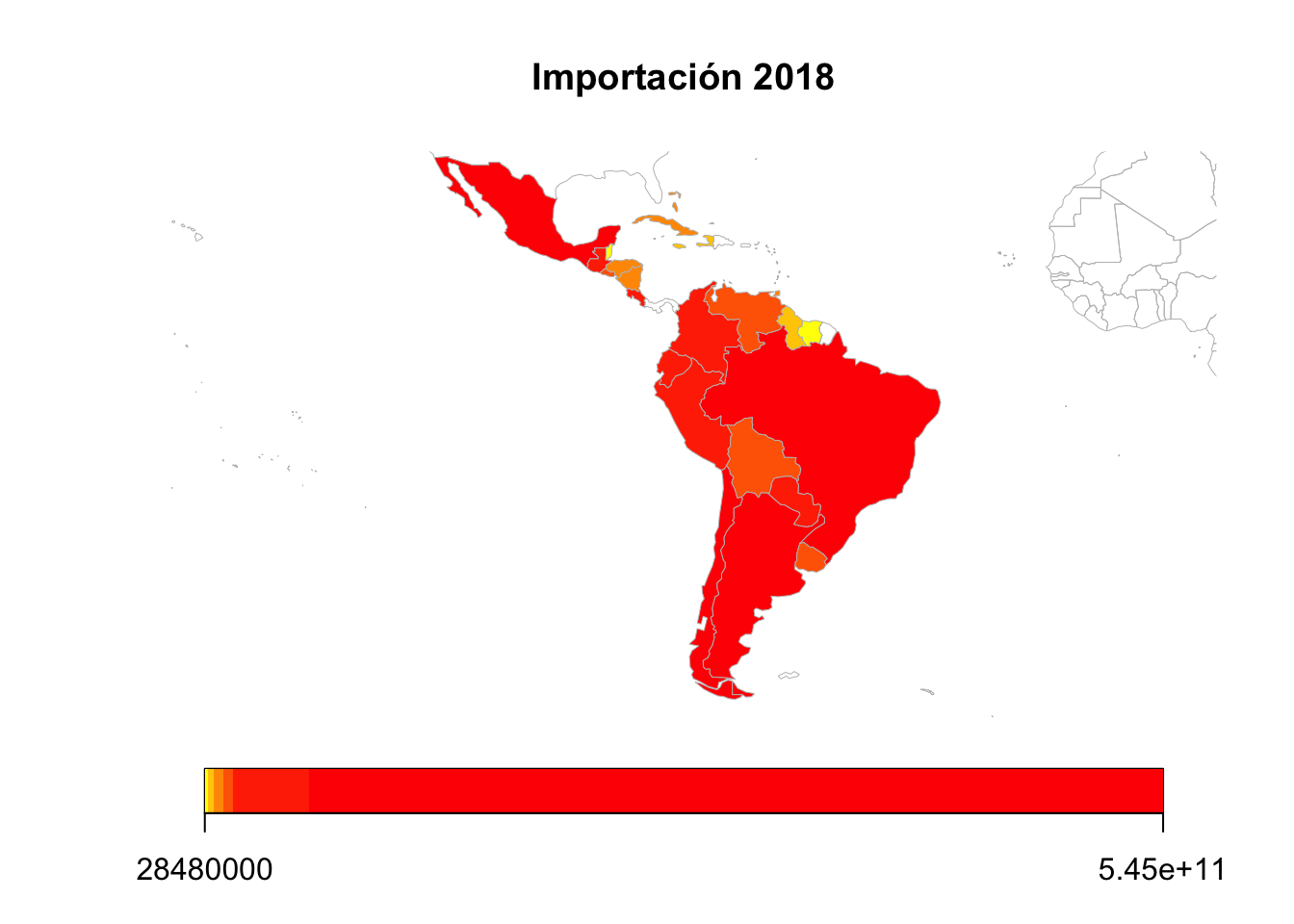 El mapa parece indicar que la mayoría de los países de la región importan al mismo nivel. Menos algunos países chicos en America Central, el Caribe, Venezuela, Bolivia y Uruguay, los cuales parecen ser los que menos importan (más amarillas menos importaciones).