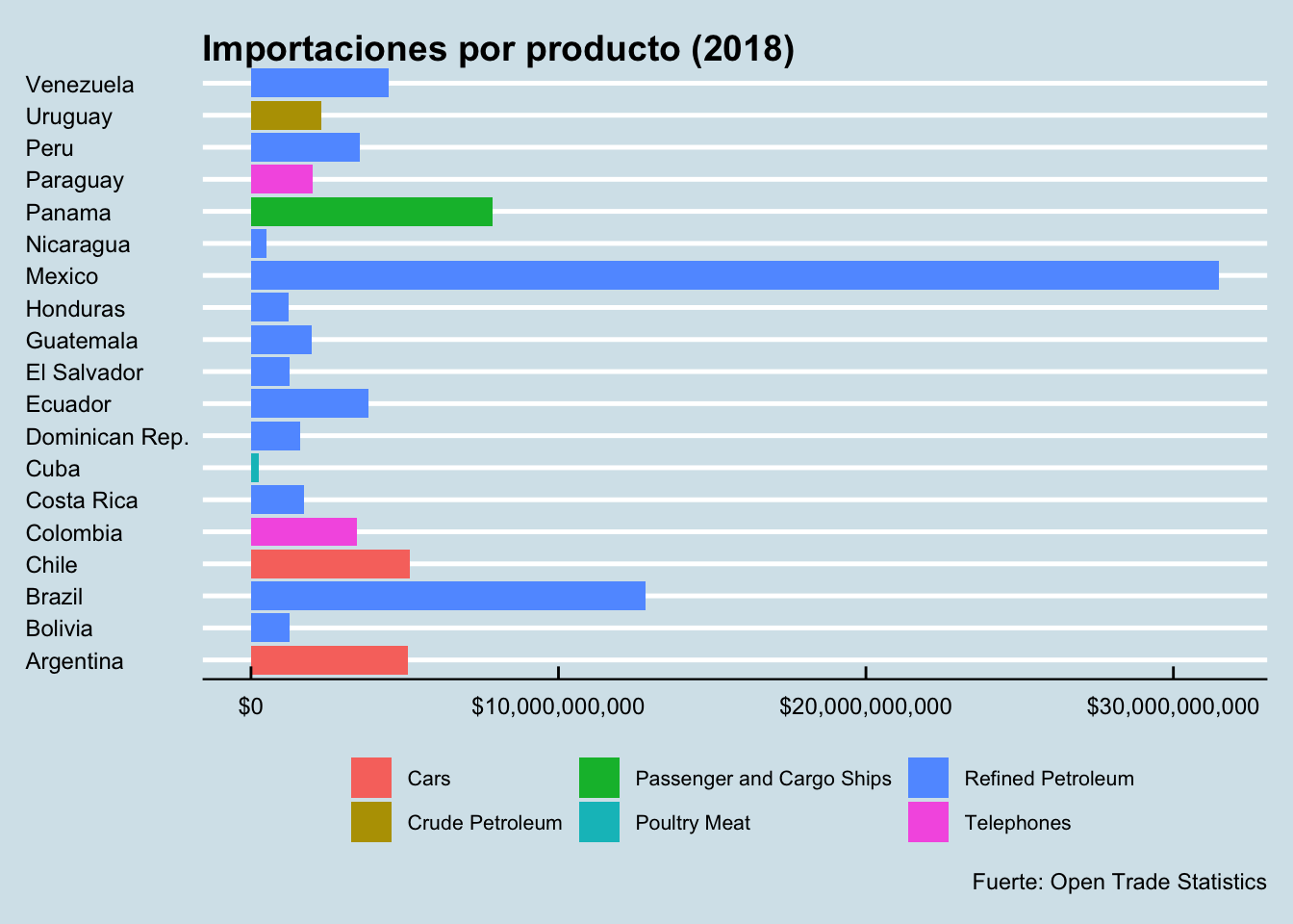 Está claro que los productos que más se importaron en América Latina en 2018 fueron petroleum refineado (74,53%) y autos (12,28%). Eso se alinea muy bien con los hallazgos del breve analisis de la evolución de los flujos de importación en la región.